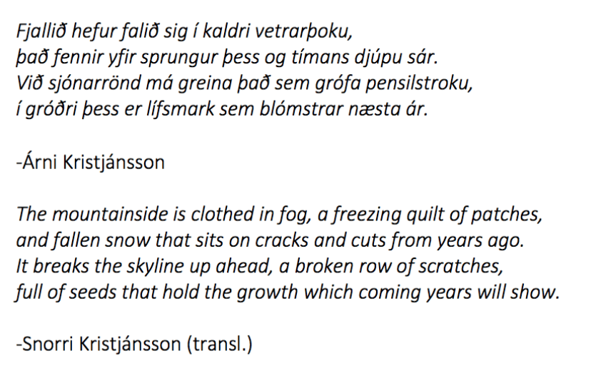 The poems – all about the effect of climate change on our planet – were written by four Icelandic elementary school students: Sigurbjörn Hermannsson (7th grade), Svava Dröfn Davíðsdóttir (7th grade), Vigdís Sara Vignisdóttir (3rd grade) and Þórir Sólbjartur Ínuson (7th grade).