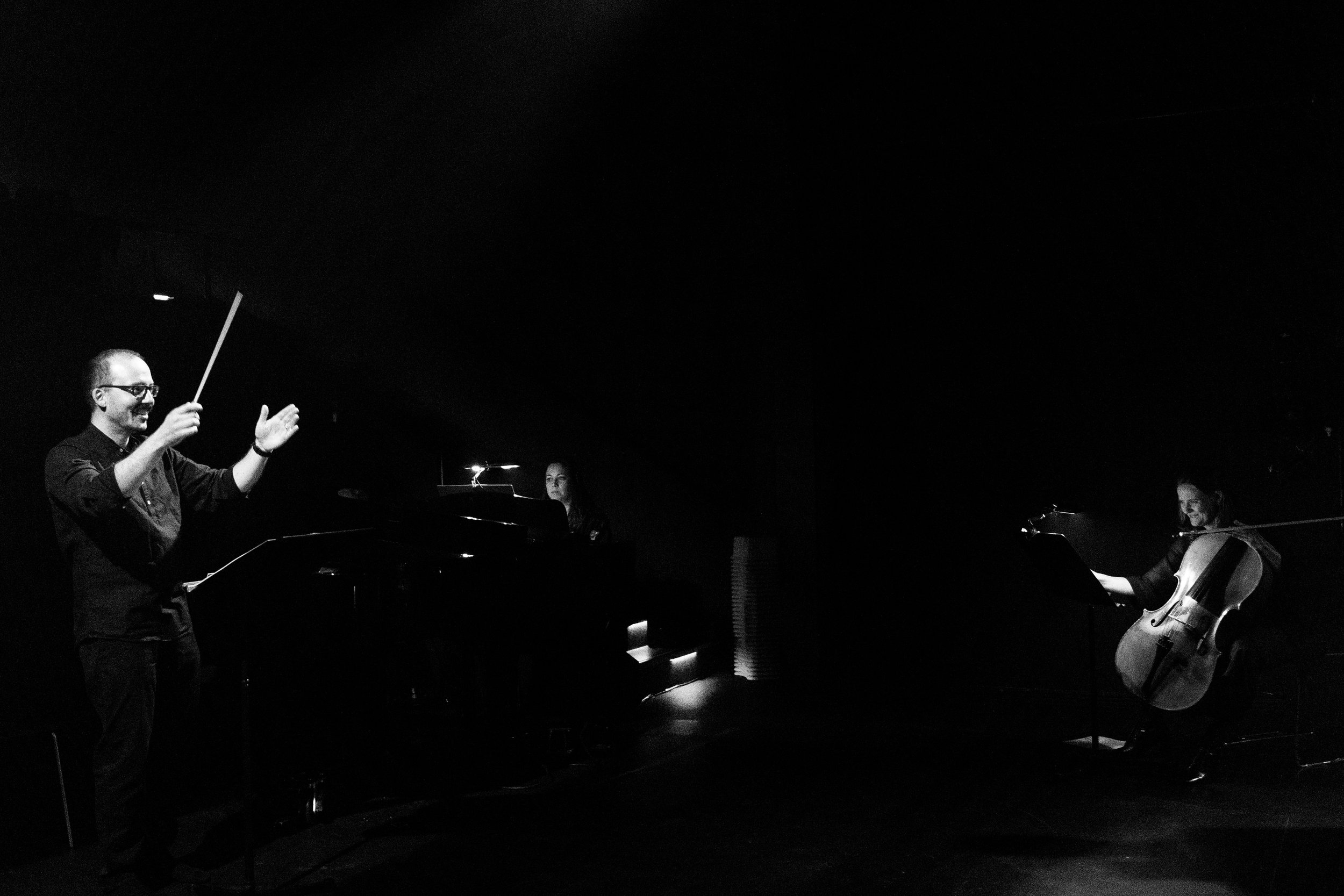 Helgi R. Ingvarsson conducting the stage with Matthildur Anna on the piano and Guðný Jónasdóttir on the cello during a performance of Ingvarsson’s Þögnin / The Silence opera in Reykjavík, August 2022.