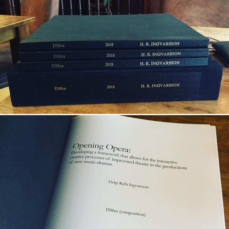 In April 2018 Dr. Helgi Rafn Ingvarsson completed his doctorate degree in music composition (DMus) at the renowned Guildhall School of Music and Drama in London, generously supported by the Guildhall School Trust. The research is titled “Opening Opera: Developing a framework that allows for the interactive creative processes of improvised theatre in the productions of new music-dramas.”